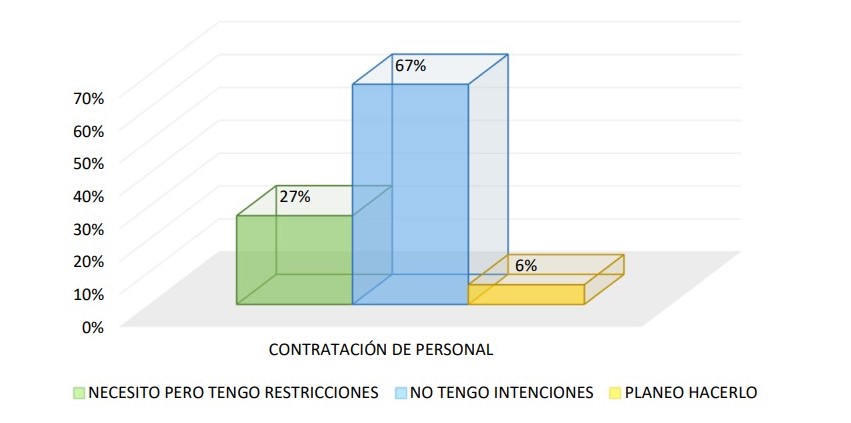 Aunque un importante grupo de empresas necesitaría contratar mano de obra pero tiene restricciones para hacerlo (27%); los datos indican que no hay intenciones de contratación (67%) y que, únicamente un porcentaje mínimo planifica hacerlo (6%).
