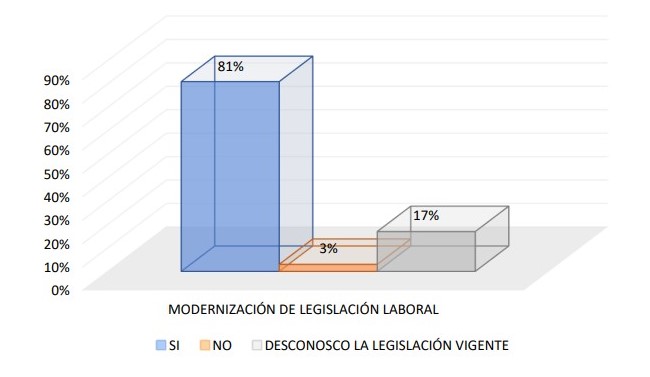 Un 81% de las empresas participantes está de acuerdo con la modernización de la legislación laboral vigente, mientras únicamente un 3% no está de acuerdo.
