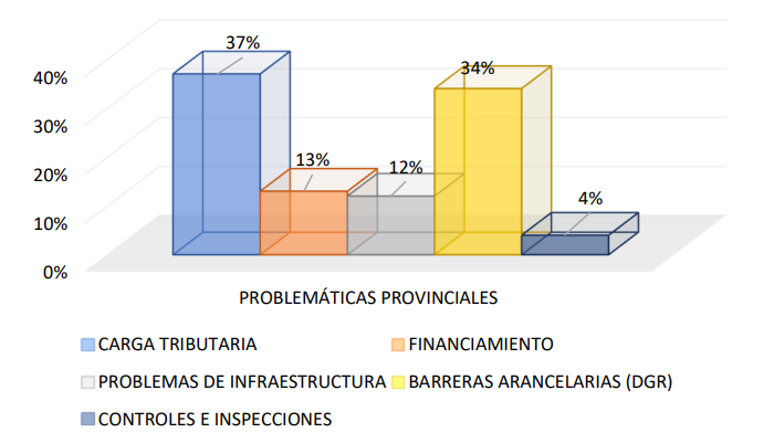 En cuanto a las PROBLEMÁTICAS PROVINCIALES, se observan la carga tributaria (37%) y las barreras arancelarias (DGR) (34%), seguidas por problemas con la infraestructura (12%), el financiamiento (13%).