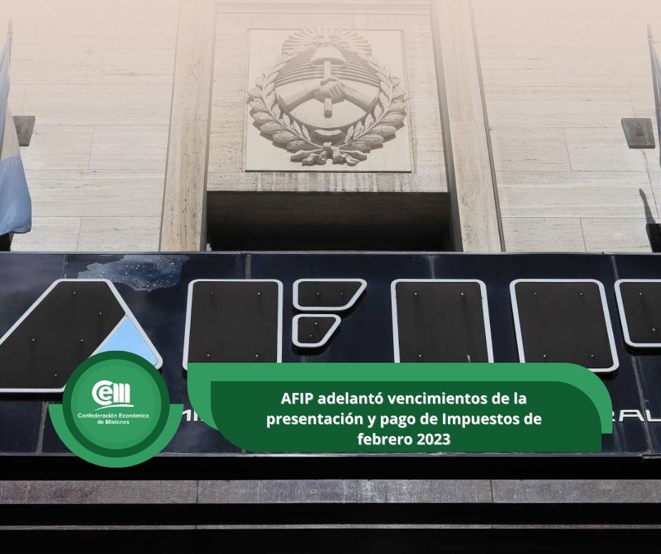 La Comisión de Asuntos Tributarios de CAME informa que la Administración Federal de Ingresos Públicos (AFIP) resolvió adelantar al 23 y 24 de febrero el vencimiento para el cumplimiento de la determinación e ingreso de ciertas obligaciones impositivas, que originalmente estaba fijado para 27 y 28 de este mes, a través de la Resolución General 5323/23, publicada este martes en el Boletín Oficial.