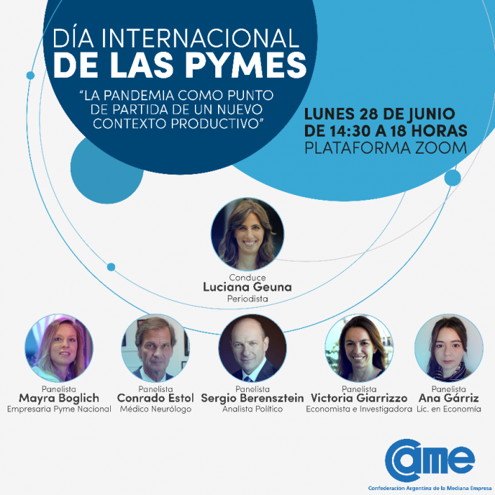 Bajo el eje "La pandemia como punto de partida de un nuevo contexto productivo", un año más desde la Confederación Argentina de la Mediana Empresa (CAME) llevará a cabo la celebración del Día Internacional de las Pymes, fecha que se conmemora desde 2017 en todo el mundo para reivindicar el papel fundamental de este sector que representa el 99% del tejido empresarial y genera más del 70% de empleo en Argentina. La cita será el próximo lunes 28 de junio, de 14.30 a 18 horas, a través de la plataforma Zoom.