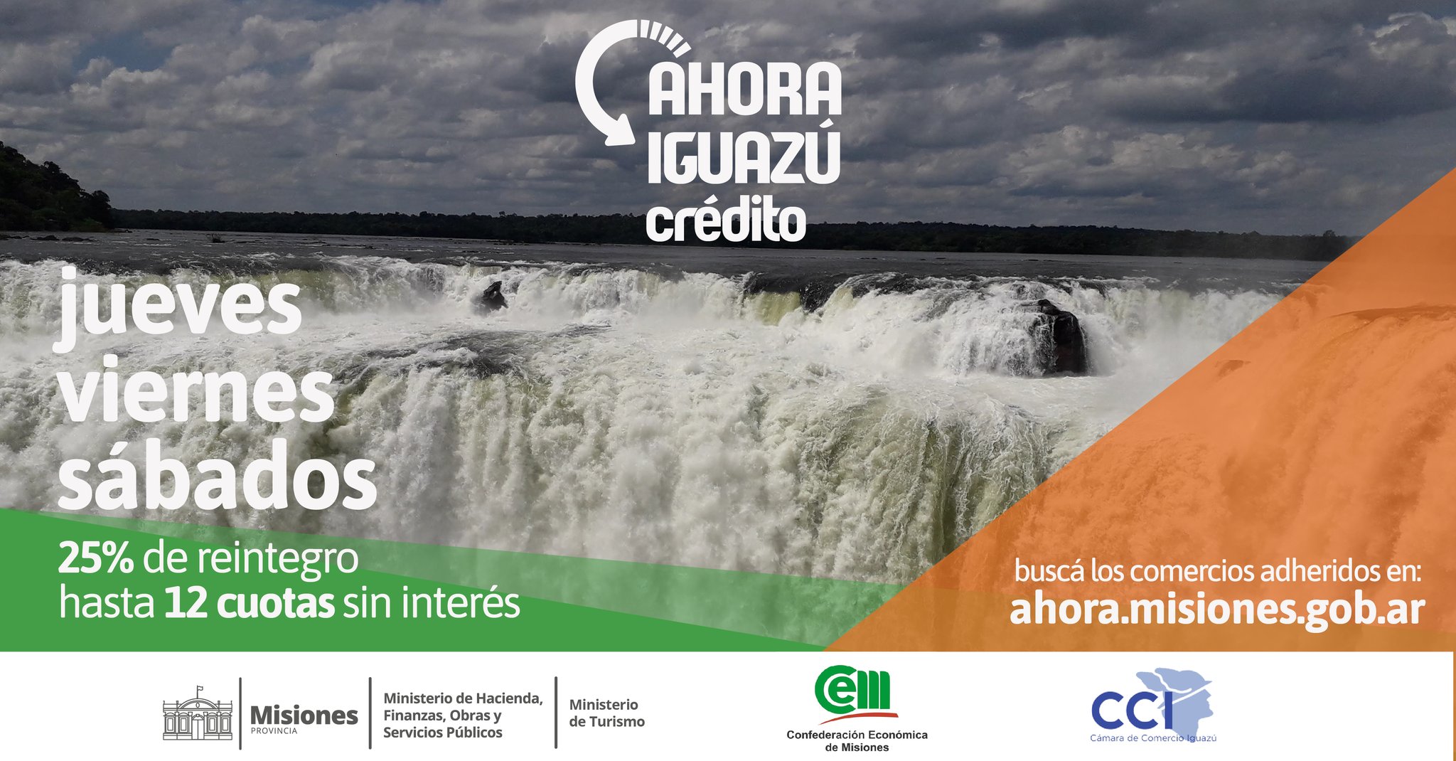 AHORA IGUAZÚ CRÉDITO: hasta en 12 cuotas sin interés con un monto tope de operaciones de $100.000, y un reintegro del 25% con tope mensual de $4.000 para compras con tarjetas de crédito de los bancos Macro y Nación.