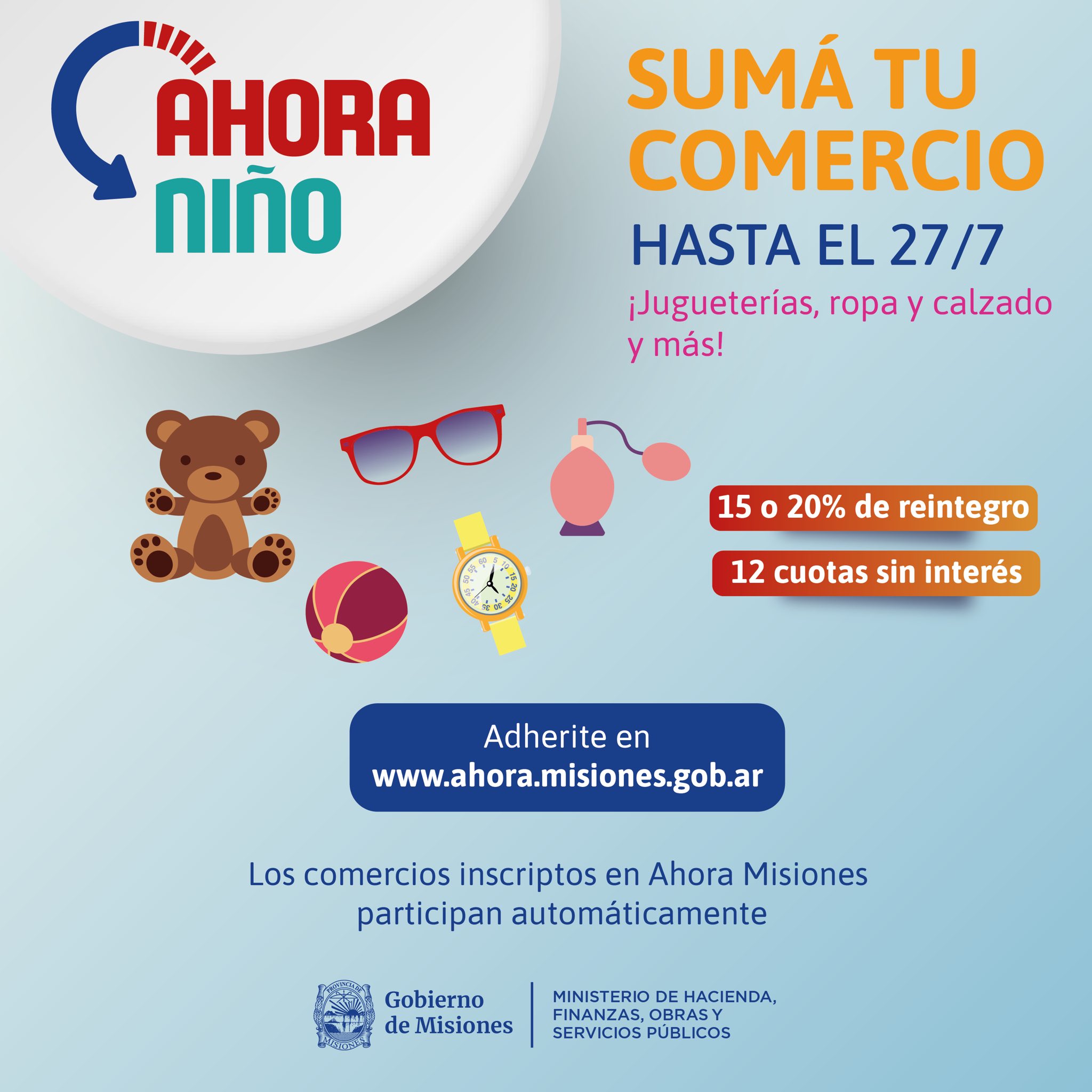 Los comercios que quieran adherirse al programa Ahora Niño podrán hacerlo a través de la página hasta hoy 27 de julio: http://ahora.misiones.gob.ar ⁣ ⁣