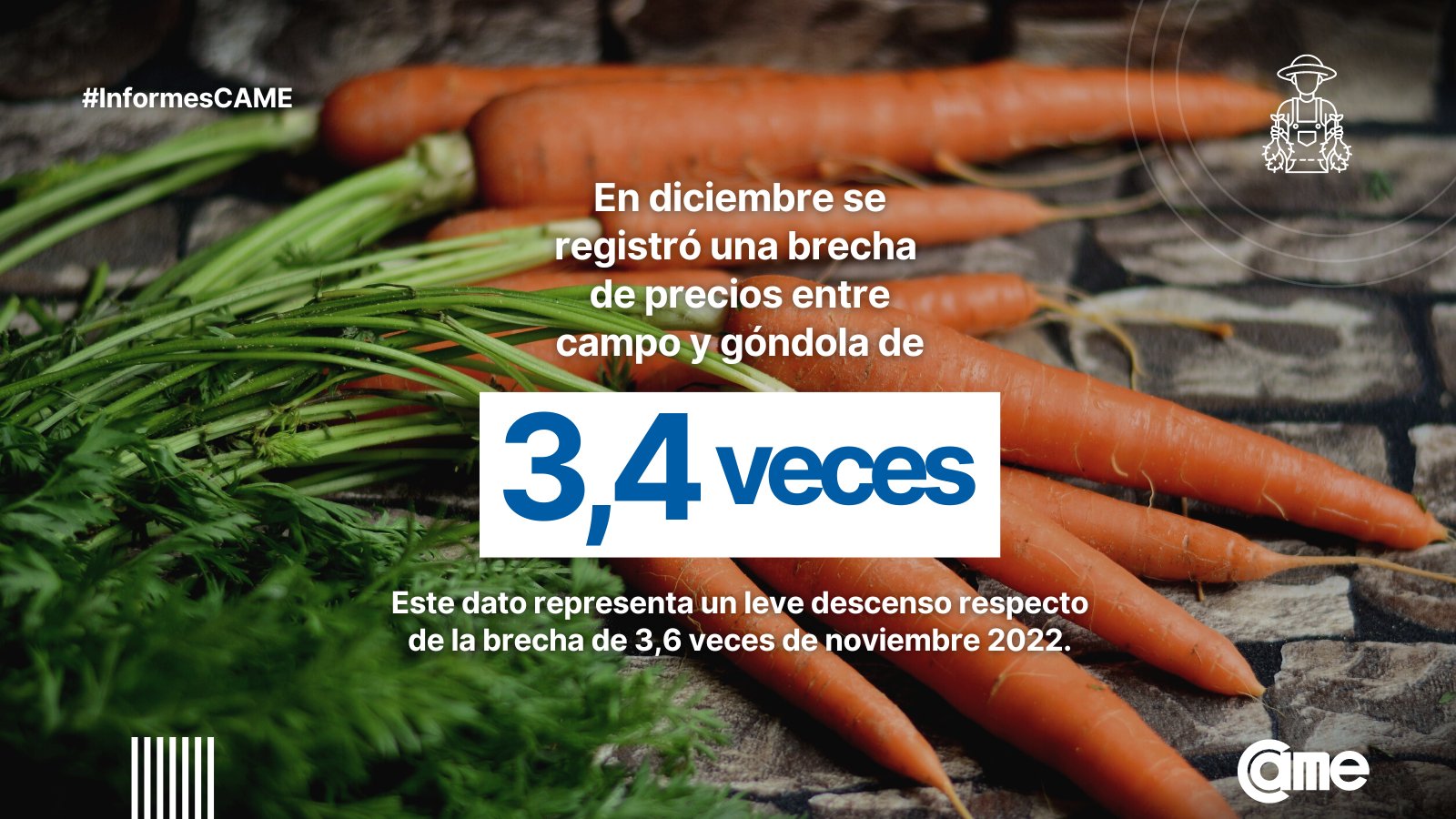 Según el Índice de Precios en Origen y Destino (IPOD), elaborado por el sector de Economías Regionales de la Confederación Argentina de la Mediana Empresa (CAME), en diciembre los precios de los productos agropecuarios se incrementaron 3,4 veces desde que salieron del campo (origen) hasta que llegaron a la góndola (destino). Este dato representa un leve descenso respecto de la brecha de 3,6 veces de noviembre 2022.