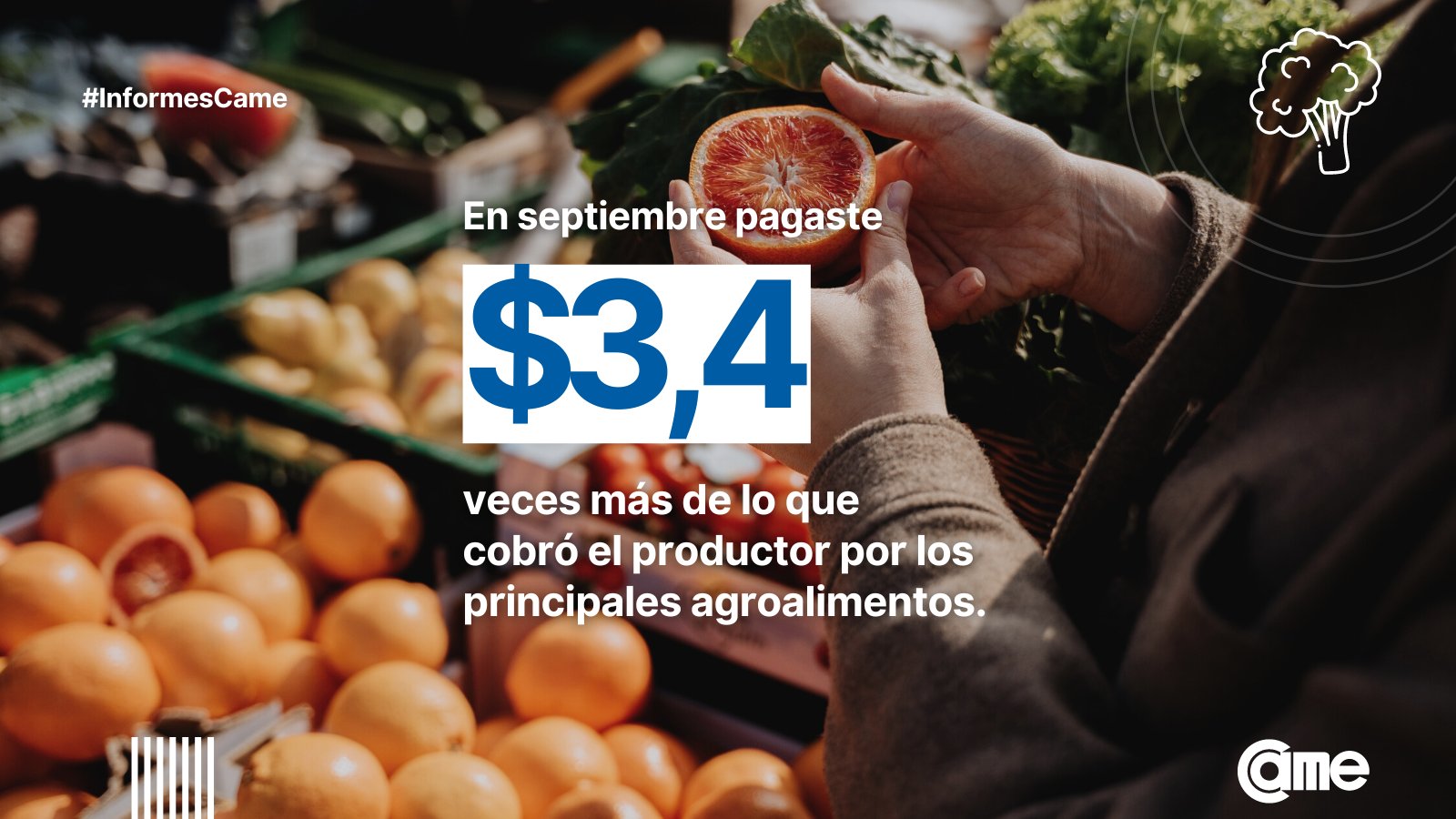 Según el Índice de Precios en Origen y Destino (IPOD) elaborado por el sector de Economías Regionales de la Confederación Argentina de la Mediana Empresa (CAME), en septiembre los precios de los productos agropecuarios se incrementaron 3,4 veces desde que salieron del campo (origen) hasta que llegaron a la góndola (destino). Es decir, los consumidores pagaron $3,4 por cada $1 que recibieron los productores de los 24 agroalimentos que componen la canasta IPOD.
