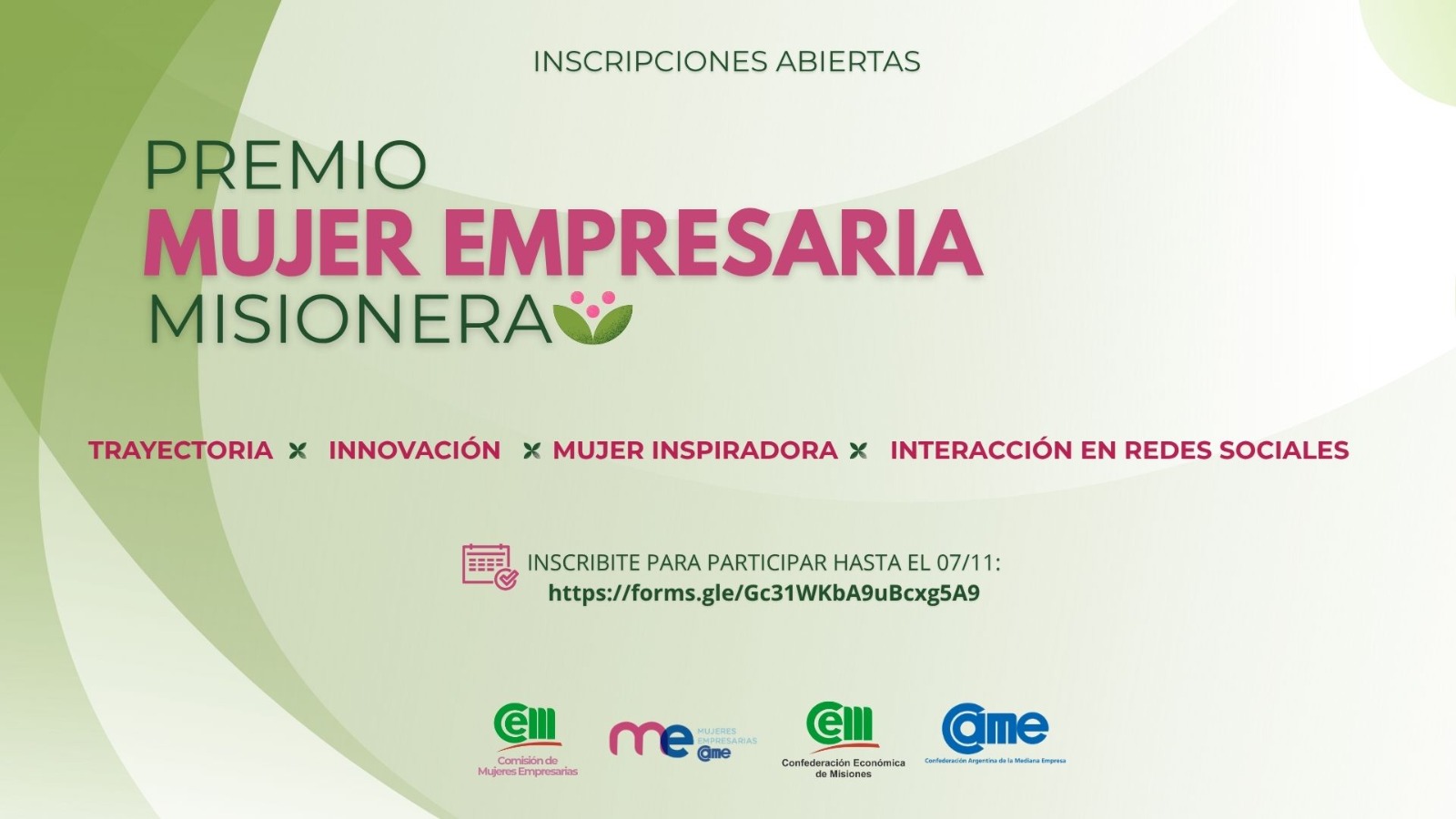 La Confederación Económica de Misiones (CEM) convoca a participar del Premio MUJER EMPRESARIA, certamen que reconoce la labor de las mujeres empresarias, motivando su participación en el mundo empresarial y fomentando el desarrollo de proyectos que impulsen la actividad de las pymes en la provincia.