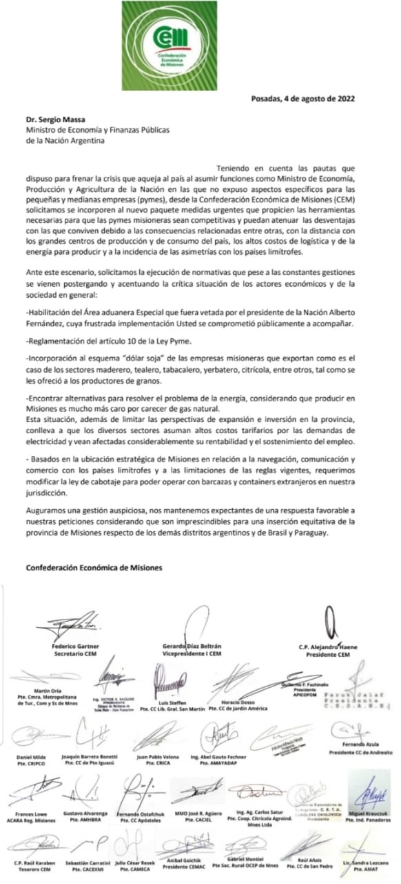Desde la Confederación Económica de Misiones (CEM) solicitaron al Ministro de Economía, Producción y Agricultura de la Nación, Sergio Massa, que se incorporen a las pautas que dispuso para frenar la crisis que aqueja al país “medidas urgentes para que las pequeñas y medianas empresas (pymes) misioneras sean competitivas” entre las que se puntualizan: la habilitación del Área Aduanera Especial, la reglamentación del artículo 10 de la Ley Pyme, la incorporación al esquema “dólar soja” de las empresas misioneras que exportan y alternativas para resolver el problema de la energía considerando “que producir en Misiones es mucho más caro por carecer de gas natural”.