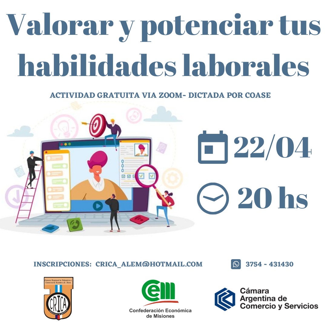 La Confederación Económica de Misiones junto con la Cámara Regional de Industria y Comercio de Leandro N. Alem (CRICA), con el apoyo de la Cámara Argentina de Comercio y Servicios (CAC) realizarán la capacitación "Valorar y potenciar tus habilidades laborales" a cargo de COASE.