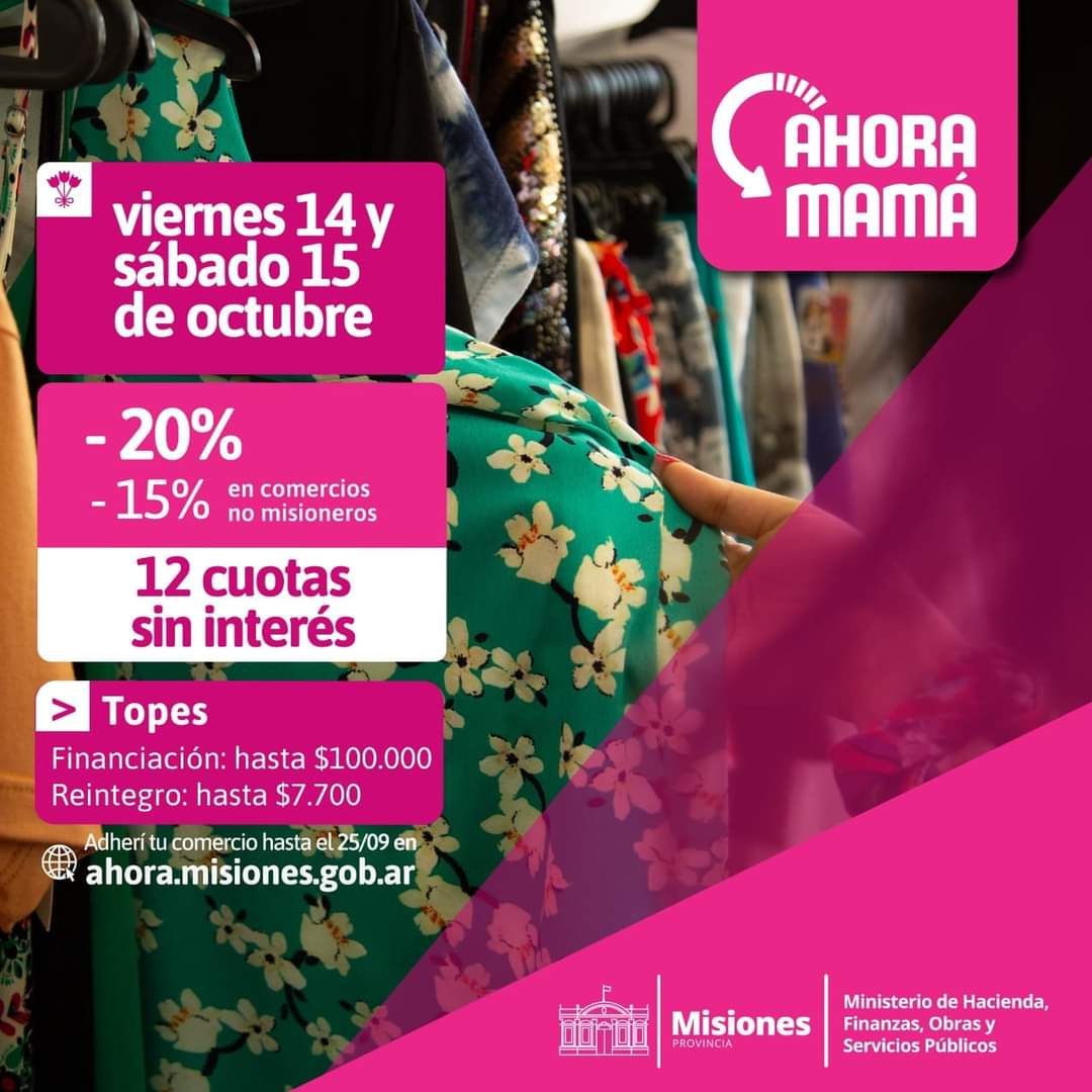 Los comercios que ya se encuentran adheridos a los programas Ahora Misiones, Ahora Misiones +21% y Ahora Bienes Durables participarán automáticamente de Ahora Mamá. Aquellos que deseen sumarse a esta propuesta podrán completar el formulario de solicitud hasta el domingo 25 de septiembre inclusive a través del siguiente enlace: https://programaahora.misiones.gob.ar/ahora-mama/