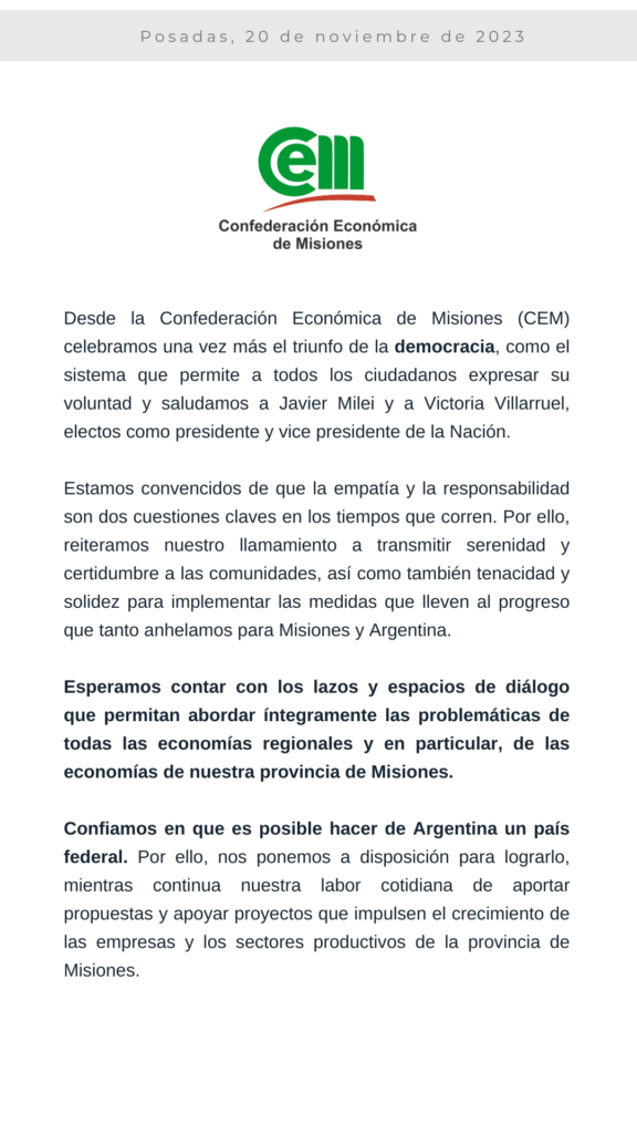 Desde la Confederación Económica de Misiones (CEM) y sus instituciones asociadas, celebran el triunfo de la democracia como el sistema que permite a todos los ciudadanos expresar su voluntad. También, saludan a Javier Milei y a Victoria Villarruel, electos como presidente y vice presidente de la Nación respectivamente.