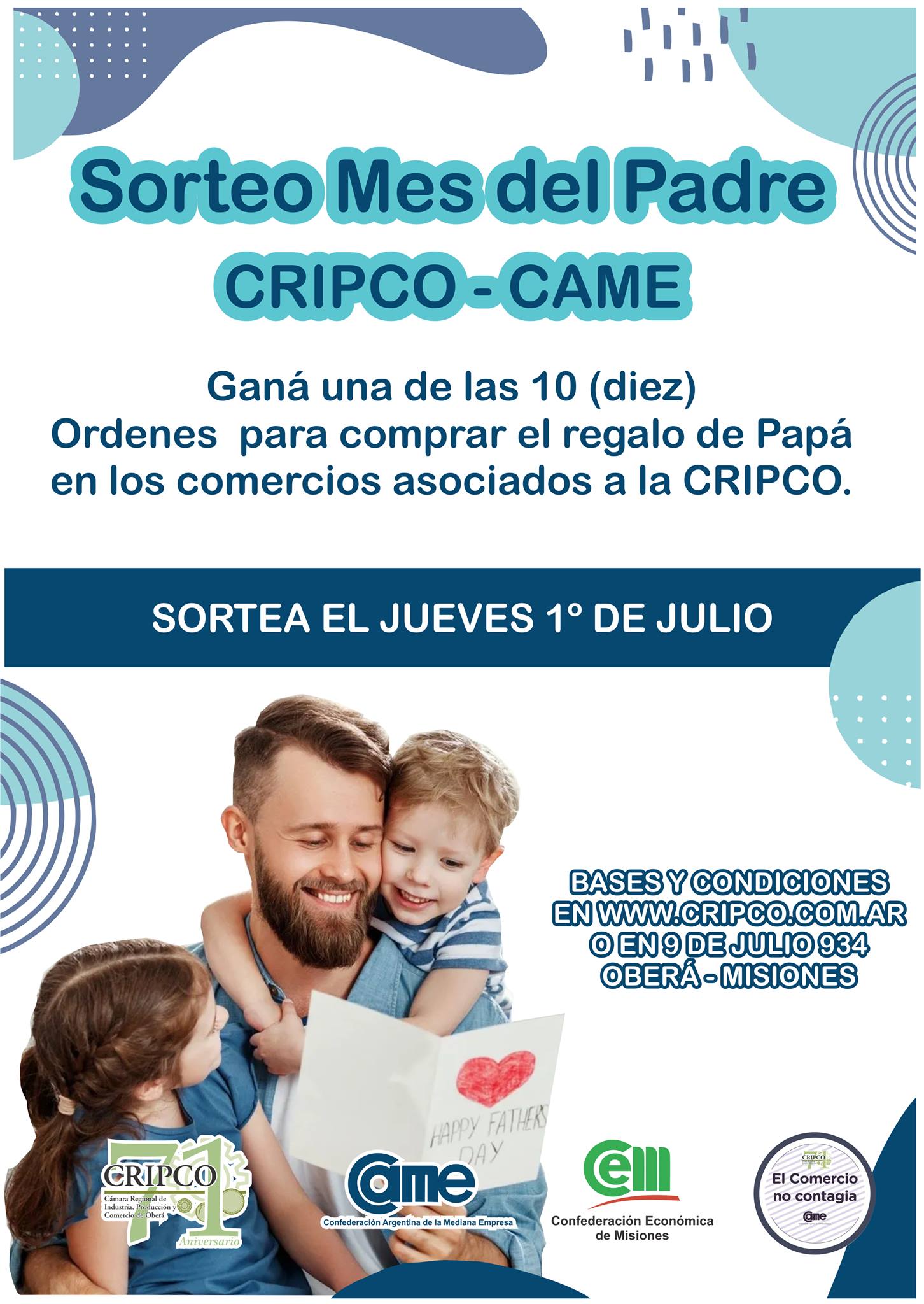 La CÁMARA REGIONAL DE INDUSTRIA, PRODUCCIÓN Y COMERCIO DE OBERÁ (CRIPCO), en una acción conjunta con la CONFEDERACIÓN ARGENTINA DE LA MEDIANA EMPRESA (CAME), lanzan la presente Promoción denominada “Mes del Padre”, cuya vigencia será del 10 de Junio del 2021 al 30 de junio del 2021, destinada al público en general, sin obligación de compra.